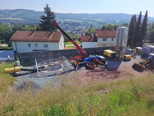 Derzeitig wird vom Christopherschacht aus an der Stollenumfahrung gearbeitet. Der Christopherschacht samt Baustelleneinrichtung befindet sich hinter dem Friedhof an der Bremersgasse. Von hier aus wurden bereits knapp 50 m der Stollenumfahrung bergwärts im gebirgsschonenden Verfahren (keine Sprengungen) hergestellt. Die Arbeiten von der Baustelleneinrichtung am Christopherschacht werden noch bis voraussichtlich April 2024 andauern und sich kurzzeitig bis zum Ende des Jahres 2023 gar noch intensivieren. Ab Mai 2024 ist vorgesehen im Gegenortprinzip vom St. Katharina Förderschach, der sich auf dem Bauhofgelände befindet, weiterzuarbeiten. Damit zieht die Baustelle auch wieder mit um. Nichtsdestotrotz gilt hier der bergmännische Spruch "Vor der Hake ist es duster" und was bei den Arbeiten tatsächlich noch für Hindernisse angetroffen werden, ist zurzeit nicht abschließend abschätzbar. Das Bergamt Nordbayern hofft diesen zeitlichen Fahrplan einhalten zu können, um auch den anliegenden Anwohnern, die durch die Baustelle am Christopherschacht Beeinträchtigungen erfahren, wieder Normalität zu verschaffen. An dieser Stelle möchte sich das Bergamt Nordbayern ganz besonders bei den anliegenden Anwohnern für die bisher ertragenen Beeinträchtigungen ausgehend von der Baustelle am Christopherschacht bedanken. Die beigefügte Abbildung soll einen Eindruck von der bergmännischen Baustelleneinrichtung sowie vom Mundloch des Schachtes vermitteln.
