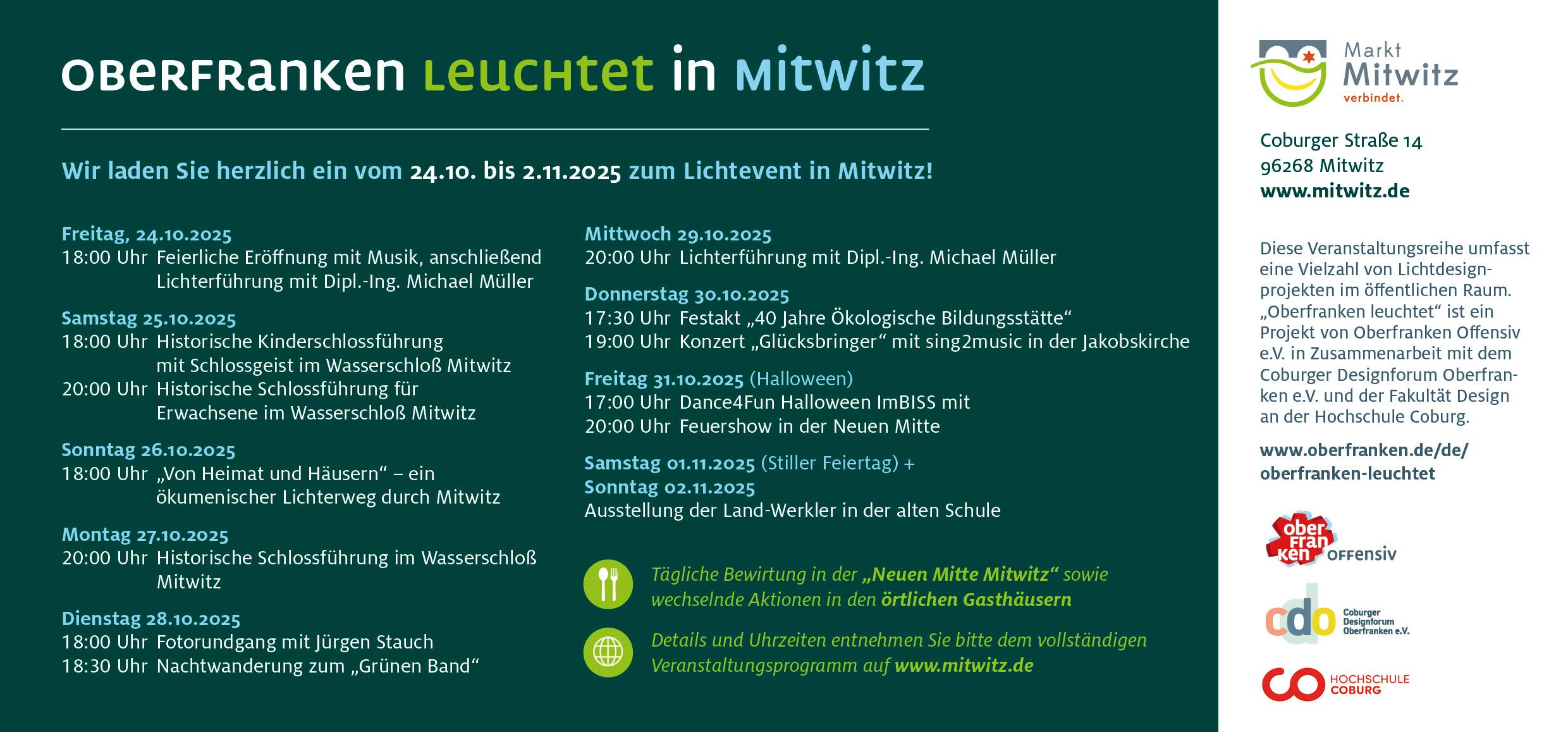17. Oktober 2025: Mitwitz wird leuchten. Vom 24. Oktober bis 2. November 2025 verwandelt sich der historische Ortskern im Rahmen des Projekts „Oberfranken leuchtet“ in eine atmosphärische Lichtlandschaft.