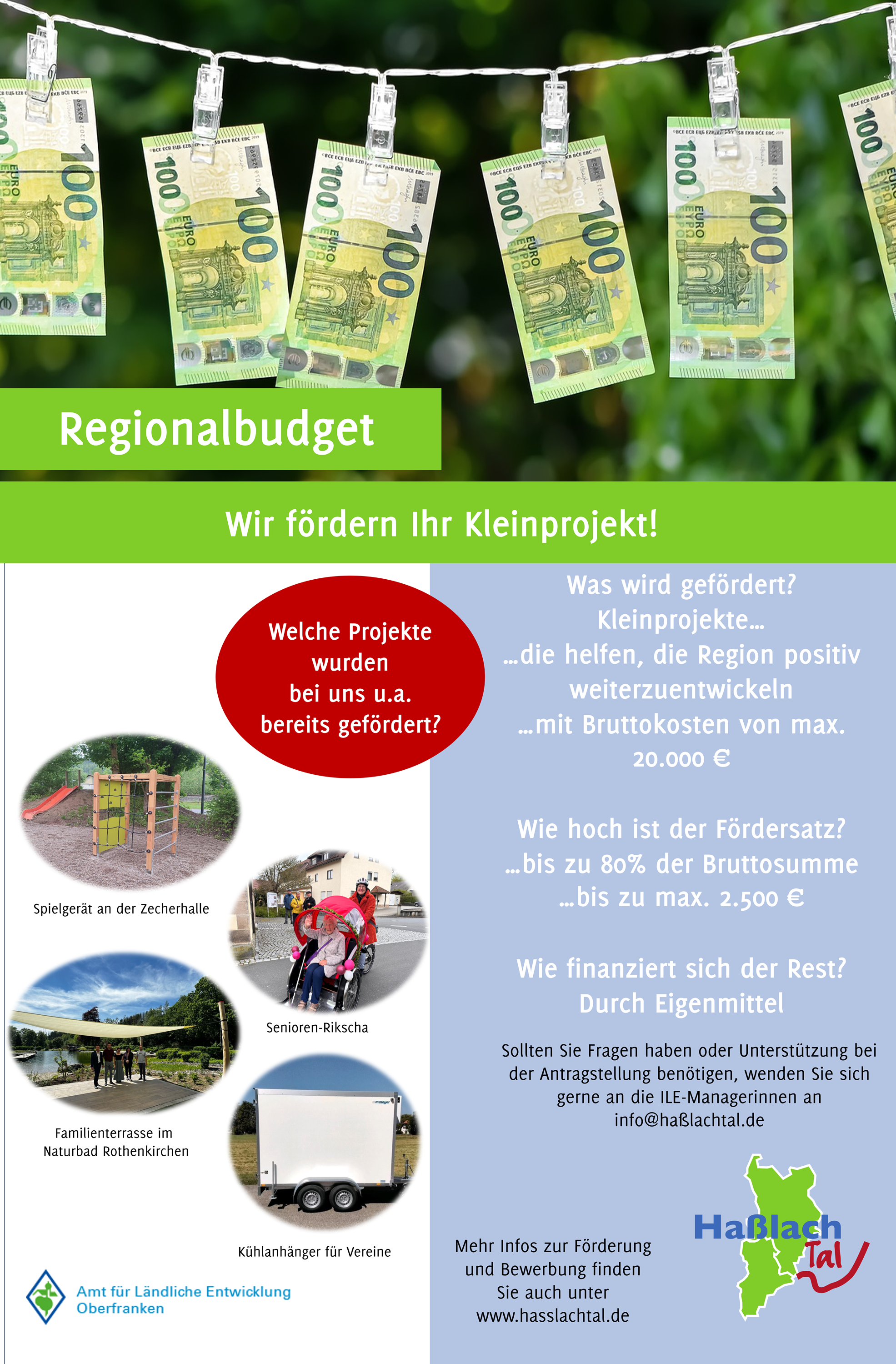 Die Erfolgsgeschichte Regionalbudget geht auch 2026 weiter. Ab sofort sucht die ILE Haßlachtal Projekte für die nächste Förderrunde. Vorbehaltlich der Förderzusage des Amts für Ländliche Entwicklung kann die ILE Haßlachtal im Jahr 2026 Kleinprojekte mit bis zu 2.500 Euro pro Projekt fördern. 90 Prozent der Fördersumme stammen dabei vom Amt für Ländliche Entwicklung Oberfranken, die restlichen 10 Prozent trägt die beteiligte Gemeinde. Ein Kleinprojekt im Sinne des Regionalbudgets ist ein Vorhaben mit Bruttokosten zwischen 625 und 20.000 Euro. Antragsberechtigt sind neben den Kommunen auch Vereine, Privatpersonen und Unternehmen aus den ILE Haßlachtal Gemeinden Pressig und Stockheim. Insgesamt stehen der ILE Haßlachtal für das Jahr 2026 wieder insgesamt 20.000 € Fördermittel zur Verfügung.