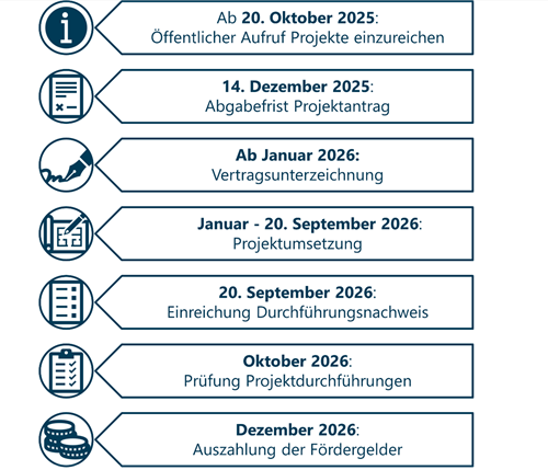 Die Förderanfragen müssen bis spätestens 14. Dezember 2025 beim ILE Management oder bei der verantwortlichen Stelle in der Gemeinde Stockheim eingegangen sein. Alle eingereichten Projektanträge werden auf Einhaltung der Fördervoraussetzungen geprüft. Die Projektauswahl erfolgt durch ein Entscheidungsgremium anhand von vorab definierten Auswahlkriterien. Aus der Bewertung aller Projekte entsteht die Reihenfolge der zu unterstützenden Projekte im Rahmen des zur Verfügung stehenden Regionalbudgets. Die Projektträger werden Ende Januar über die Entscheidung des Gremiums informiert.