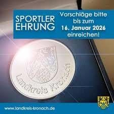 Der Landkreis Kronach möchte wieder Bürgerinnen und Bürger für ihre sportlichen Leistungen oder ihre Verdienste auf dem Gebiet der Sportbewegung auszeichnen. Dazu werden bis zum 16. Januar 2026 entsprechende Vorschläge erbeten.