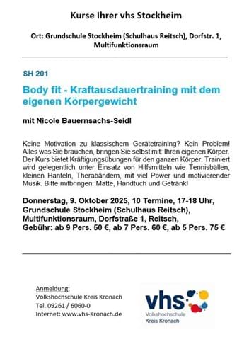 06. Oktober 2025: 10 Termine ab Donnerstag, den 9. Oktober 2025 von 17.00 - 18.00 Uhr im Schulhaus in Reitsch, Multifunktionsraum, Dorfstr. 1, 96342 Stockheim-Reitsch. Nähere Informationen im Flyer.