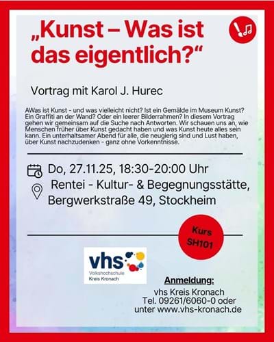 06. Oktober 2025: Vortrag mit Karol J. Hurec am Donnerstag, den 27. November 2025 von 18.30 - 20.00 Uhr in der Rentei - Kultur- und Begegnungsstätte, Bergwerksstr. 49, 96342 Stockheim. Nähere Informationen finden Sie im Flyer.