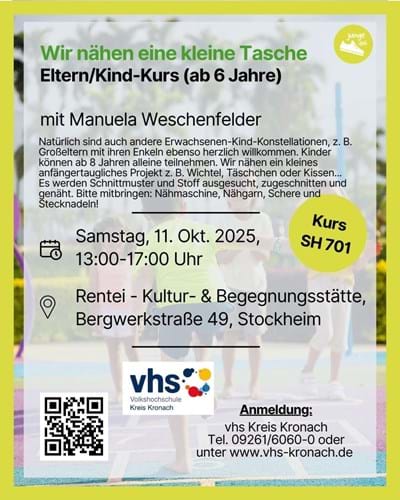 06. Oktober 2025: Am Samstag, den 11. Oktober 2025 von 13.00 - 17.00 Uhr in der Rentei - Kultur- und Begegnungsstätte, Bergwerksstr. 49, 96342 Stockheim. Natürlich sind auch andere Erwachsenen-Kind-Konstellationen, z. B. Großeltern mit ihren Enkeln ebenso herzlich willkommen! Nähere Informationen im Flyer.